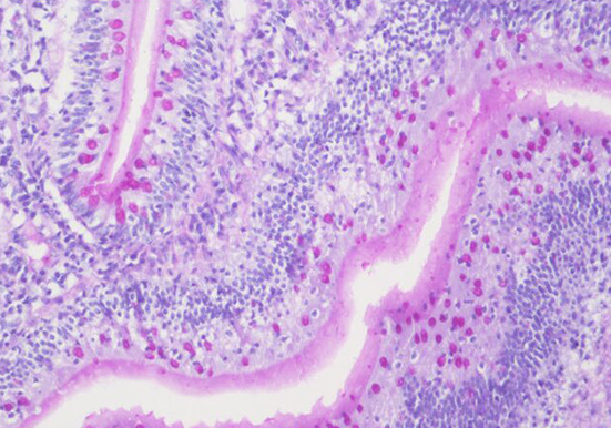 基本原理:过碘酸能使细胞内的多糖乙二醇基氧化成二醛,再与 Schiff 氏液的无色品红结合,形成紫红色复合物,定位于胞浆上。