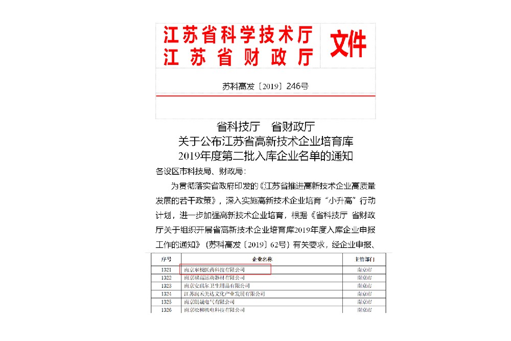 子公司东极医药入选“江苏省高新技术企业培育库”