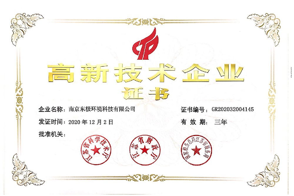 子公司东极环境被认定为“国家高新技术企业”