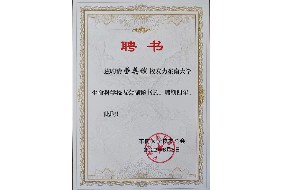 总经理劳英斌先生被聘请为东南大学生命科学校友会副秘书长
