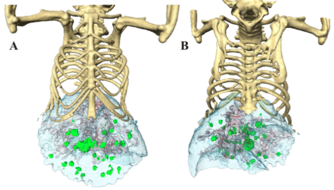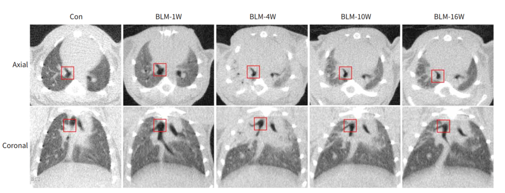 通过使用Micro-CT对小鼠肺部区域进行扫描重建成像,利用肺部分析算法(Hounsfield单位阈值范围分别为-434至-121HU和-120至121HU)实现对通气不良和非通气不良区域的影像区分,从而实现对肺部区域动态检测,并进行功能和结构的评价。量化的影像数据也能提供纵向研究的信息以减少动物之间的变异性,可以更进一步验证体外数据。