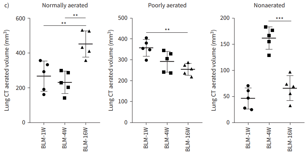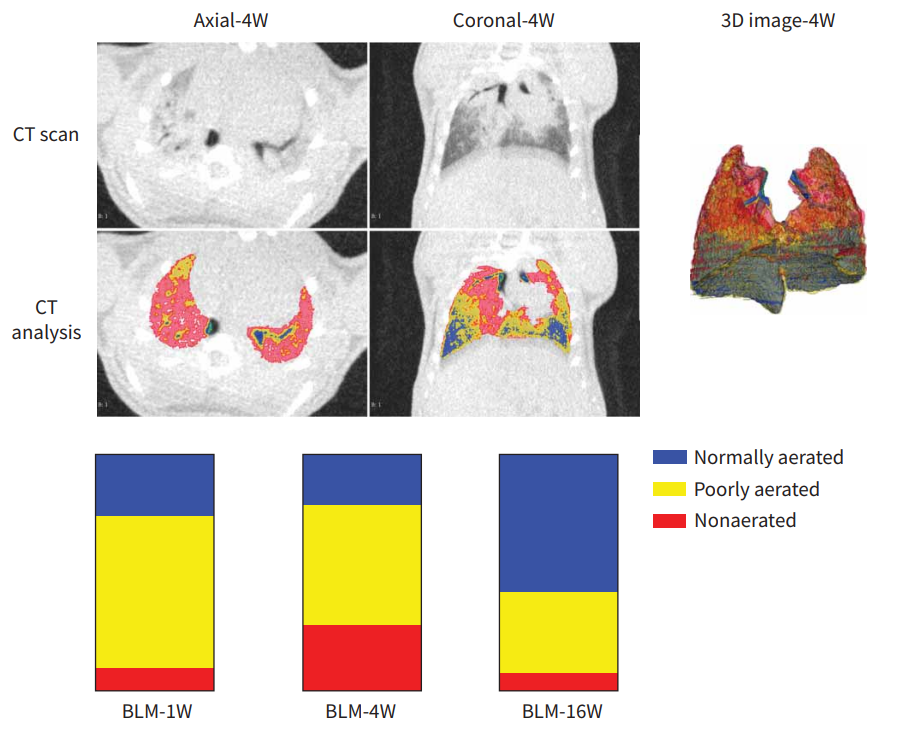 博来霉素诱导的小鼠肺纤维化模型。根据不同HU区间进行正常、低通气、不通气区域体积的分割。在第4周,结果显示低通气和不通气区域的比例都很高,然后在第10周和第16周之间明显减少,而在正常通气的区域,则呈现相反的态势。[13]