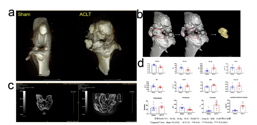 小鼠交叉韧带横断术(ACLT)骨性关节炎。a. 骨性关节炎模型3D重建图,手术组软骨下骨大面积增生、磨损。b. 内侧半月板抓取示意图 c. 股骨软骨下骨松质骨横截面,手术组骨体积减少。d. 软骨下松骨结构性参数以及胫骨平面各项参数。